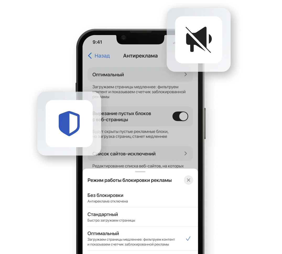 Это функция браузера, которая блокирует рекламу и лишние элементы. Антиреклама включена в браузере по умолчанию. Вы можете изменить режим блокировки рекламы и отрегулировать её количество с учетом ваших предпочтений.